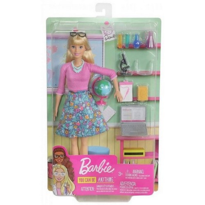 Η Barbie δασκάλα είναι έτοιμη να ηγηθεί της τάξης με ένα σετ καριέρας που περιλαμβάνει 10 παιχνίδια με θέμα το σχολείο, μερικά με λαβές που μπορεί να κρατήσει η κούκλα Barbie! Μία υδρόγειος σφαίρα και ένας φορητός υπολογιστής που ανοίγει και κλείνει προσελκύει τα νεαρά μυαλά στη διασκέδαση του ρόλου. Τα παιδιά μπορούν να βοηθήσουν την κούκλα Barbie να διδάξει μελέτες STEM με μικροσκόπιο, δύο ποτήρια, δύο φιάλες και ένα ζευγάρι γυαλιά. Ολοκλήρωσε το πρόγραμμα σπουδών και την βαθμολόγηση με ένα πρόχειρο και ένα βιβλίο. Η κούκλα Barbie είναι ντυμένη για την τάξη με μια εμφάνιση με ροζ μπλούζα και γαλάζια φλοράρ φούστα, μπλε κολιέ, άσπρα παπούτσια και μαύρα γυαλιά.