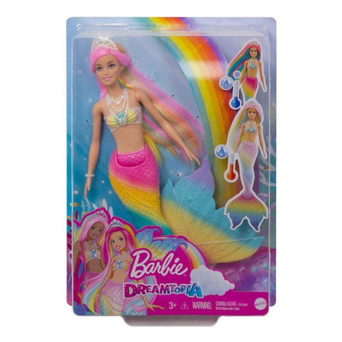 Η Barbie είναι μία μαγευτική γοργόνα με χρωματιστή ουρά και μπούστο με σχέδια της θάλασσας και πολύχρωμα μαλλιά διακοσμημένα με μία τιάρα. Έτοιμοι για αλλαγή χρώματος; Βύθισε την Barbie σε ζεστό νερό και δες τα μαλλιά, το μπούστο και την ουρά της να αλλάζουν αμέσως χρώμα! Βύθισε την σε παγωμένο νερό για να επανέλθει το αρχικό της χρώμα και παίξε ξανά και ξανά!