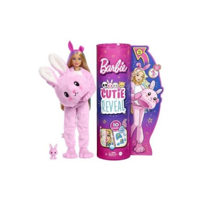 Αφαιρέστε τη στολή και ανακαλύψτε μια κούκλα Barbie με μακριά μαλλιά και λαμπερές λεπτομέρειες! Ανοίξτε τα σακουλάκια για να βρείτε αστραφτερά ρούχα, αξεσουάρ, μία χτένα και ένα μικρό λαγουδάκι. Τα παιδιά μπορούν να ντύσουν και να στολίσουν με αξεσουάρ την Barbie! Το επάνω μέρος της στολής αναποδογυρίζει και γίνεται ένα πολύ απαλό φλις μπουφάν, ενώ και το κεφάλι μετατρέπεται σε κρεβάτι για ζωάκια! Οι εκπλήξεις συνεχίζονται με την αλλαγή χρώματος! Στο πρόσωπο της Barbie εμφανίζονται σχέδια προσώπου ζώου και το λαγουδάκι της “ανοιγοκλείνει” τα μάτια του – είναι τόσο χαριτωμένο! Χρησιμοποιήστε τη χτένα και κρύο νερό για να αποκαλύψετε τα σχέδια και αλλάξτε τα πάλι με ζεστό νερό!