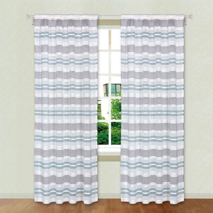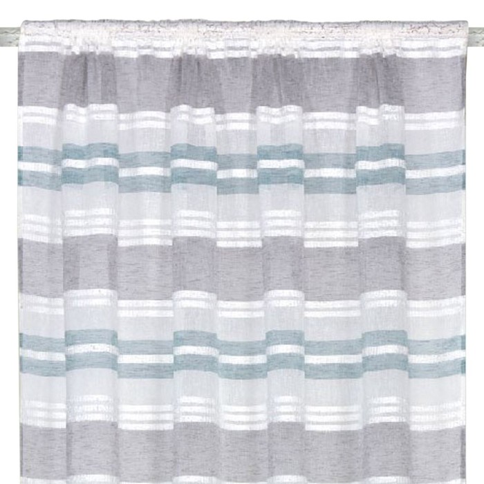 Κουρτίνα διακόσμησης με ύφασμα τύπου γάζας σε χρώμα εκρού με πετρόλ, γκρι και λευκή ρίγα, με τρέσα, ιδανική για κάθε εποχή.
