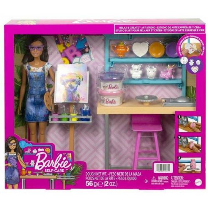Τα παιδιά μπορούν να μάθουν πώς να χαλαρώνουν με την κεραμική και τη ζωγραφική! Το Στούντιο Ζωγραφικής Barbie® περιλαμβάνει ευλύγιστη κούκλα Barbie και 25+ κομμάτια δημιουργίας, όπως σταθμό με έπιπλο και καβαλέτο, δοχεία μπογιάς, πλαστελίνη, εργαλεία διακόσμησης και ζωγραφικής και άλλα κομμάτια αφήγησης. Ο σταθμός της Barbie διαθέτει πάγκο με χώρο κατασκευής κεραμικών, ράφια, καρέκλα, καβαλέτο, παλέτα και πινέλο, καθώς και 2 δοχεία πλαστελίνης για την κατασκευή βάζων. Τα παιδιά μπορούν να βάλουν δύο διαφορετικά χρώματα πλαστελίνης (ροζ ή μοβ) σε ένα μπολ, να το τοποθετήσουν στο καλούπι και να το κλείσουν για να φτιάξουν ένα βάζο! Τοποθετήστε το βάζο στην περιστρεφόμενη βάση και διακοσμήστε το με το εργαλείο. Το βάζο είναι έτοιμο, διακοσμημένο με χαριτωμένες καρδιές και αστέρια! Τα παιδιά μπορούν να βουτήξουν το πινέλο σε κρύο νερό και να ζωγραφίσουν τα λευκά κομμάτια για αριστουργηματικές αποκαλύψεις: το πιάτο σε σχήμα καρδιάς έχει ροζ καρδιές, το αρκουδάκι έχει μοβ μάτια και το μικρό γουρουνάκι έχει μπλε σημεία στην πλάτη του. Η Barbie μπορεί να καθίσει στο καβαλέτο της και να χρησιμοποιήσει το πινέλο και την παλέτα για να ζωγραφίσει έναν όμορφο πίνακα στον καμβά (περιλαμβάνει δύο καμβάδες). ?Με όλα τα δημιουργικά αξεσουάρ για να διαλέξουν, τα παιδιά μπορούν να χρησιμοποιήσουν τη φαντασία τους για να δημιουργήσουν ξανά και ξανά! Ανακαλύψτε όλες τις κούκλες και τα παιχνίδια Barbie με θέμα τη χαλάρωση, τις τέχνες και τα χόμπι, γιατί όταν ένα παιδί παίζει με την Barbie, φαντάζεται όλα όσα μπορεί να γίνει όταν μεγαλώσει!